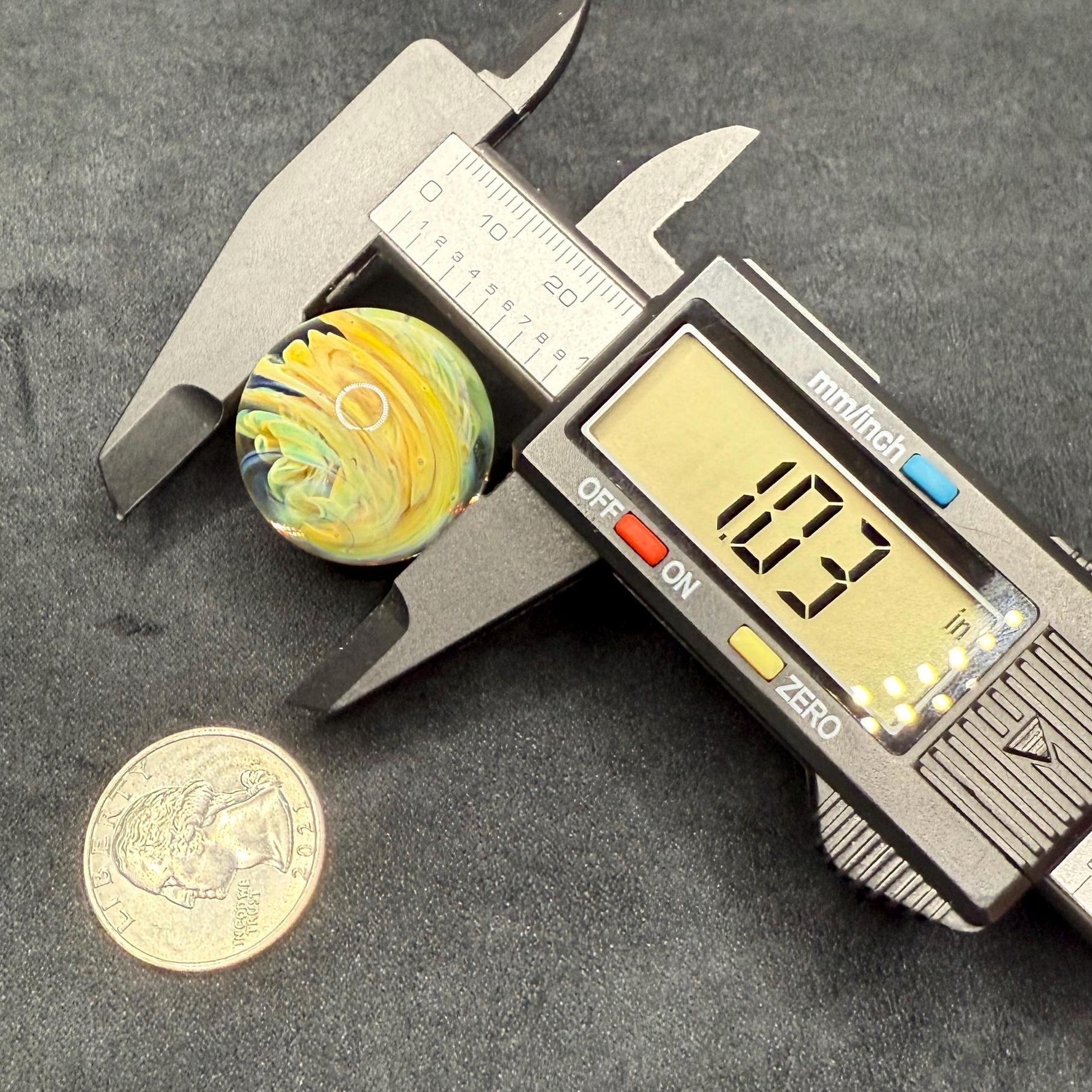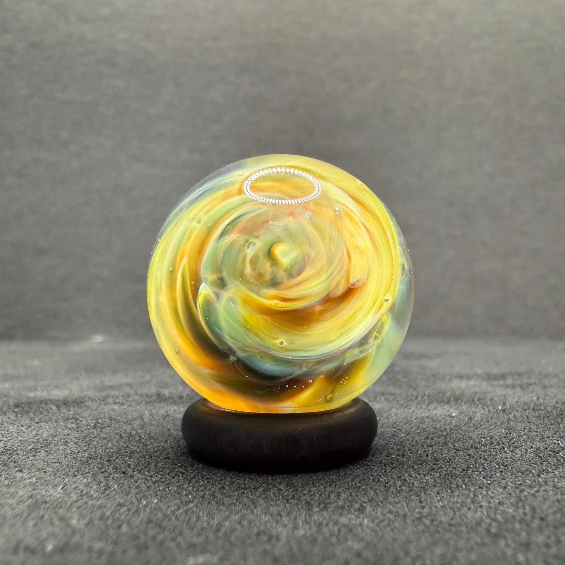 This art glass marble is made of borosilicate and features a swirling implosion ying yang in yellow and green.