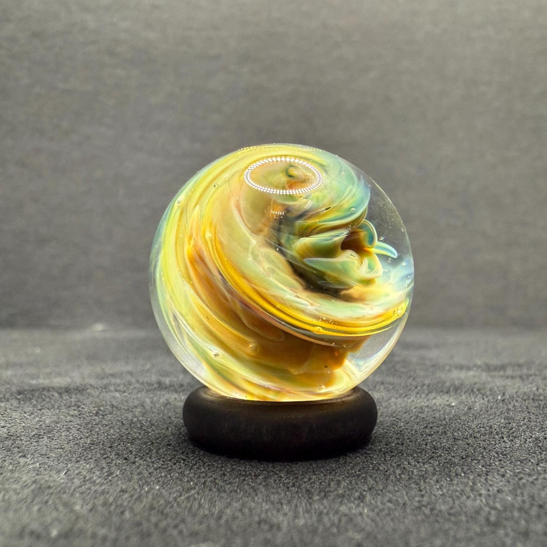 An eye catching glass marble from all angles that includes a wooden display so you can place your marble on your desk, shelf, or coffee table.