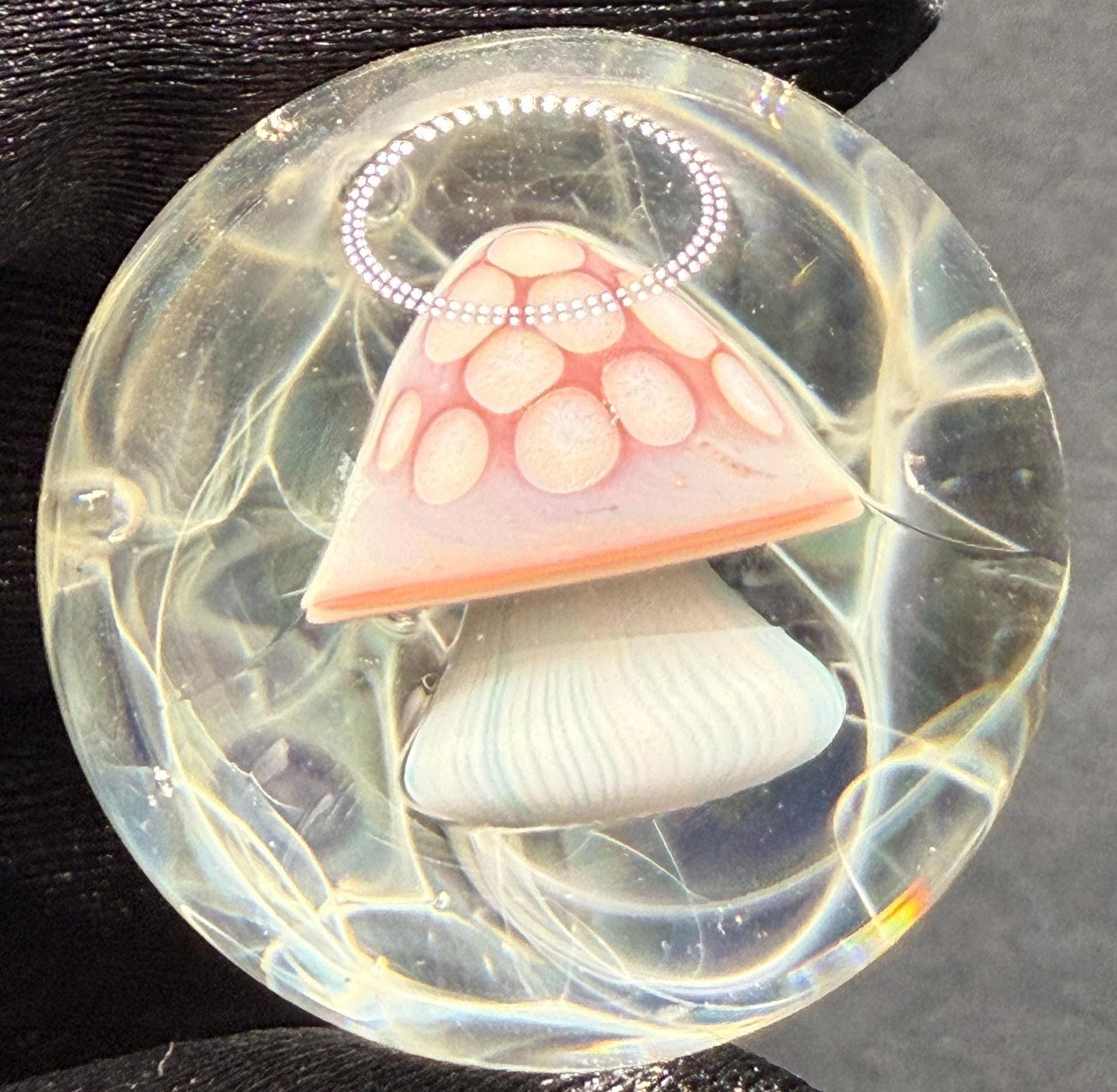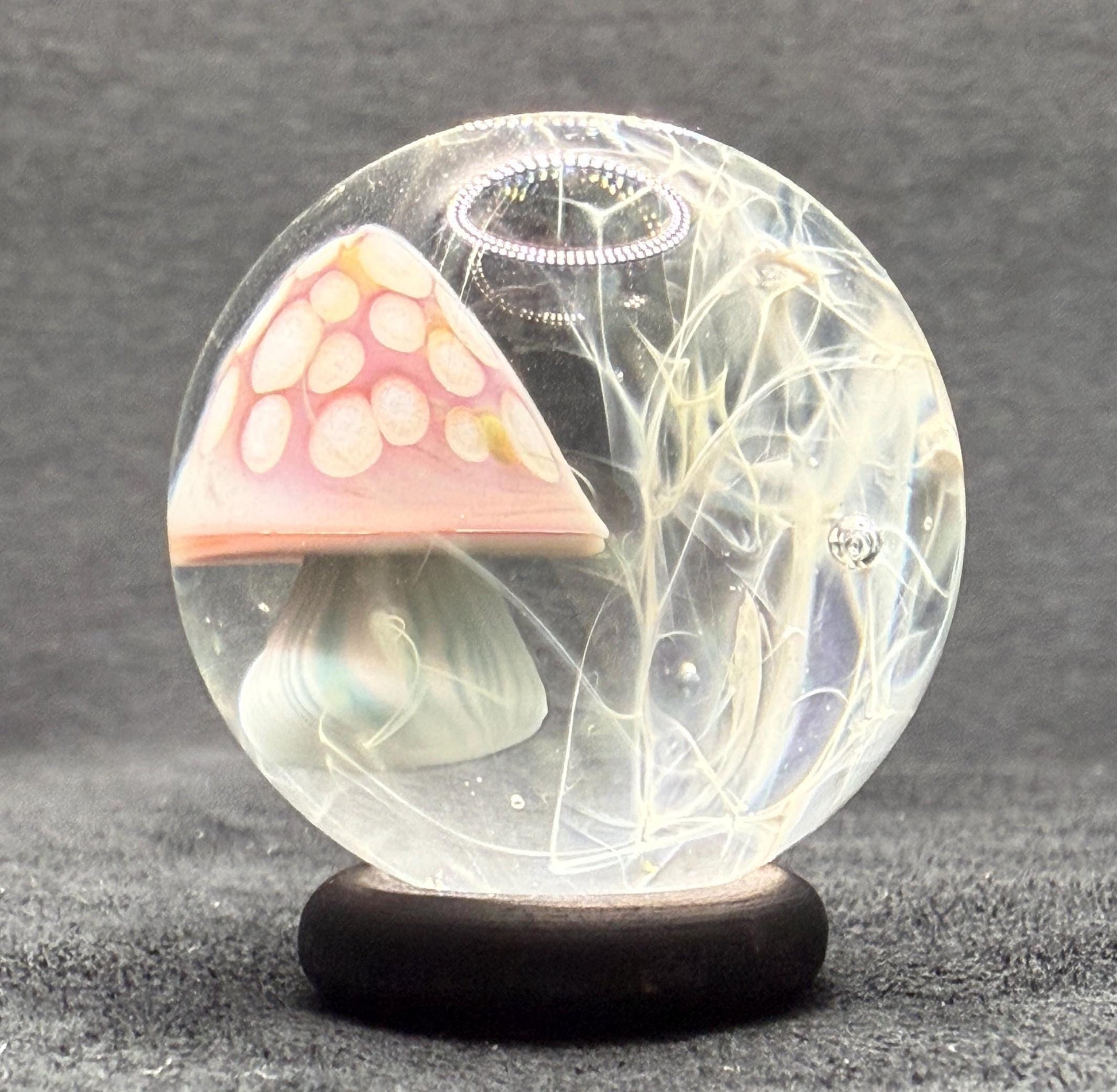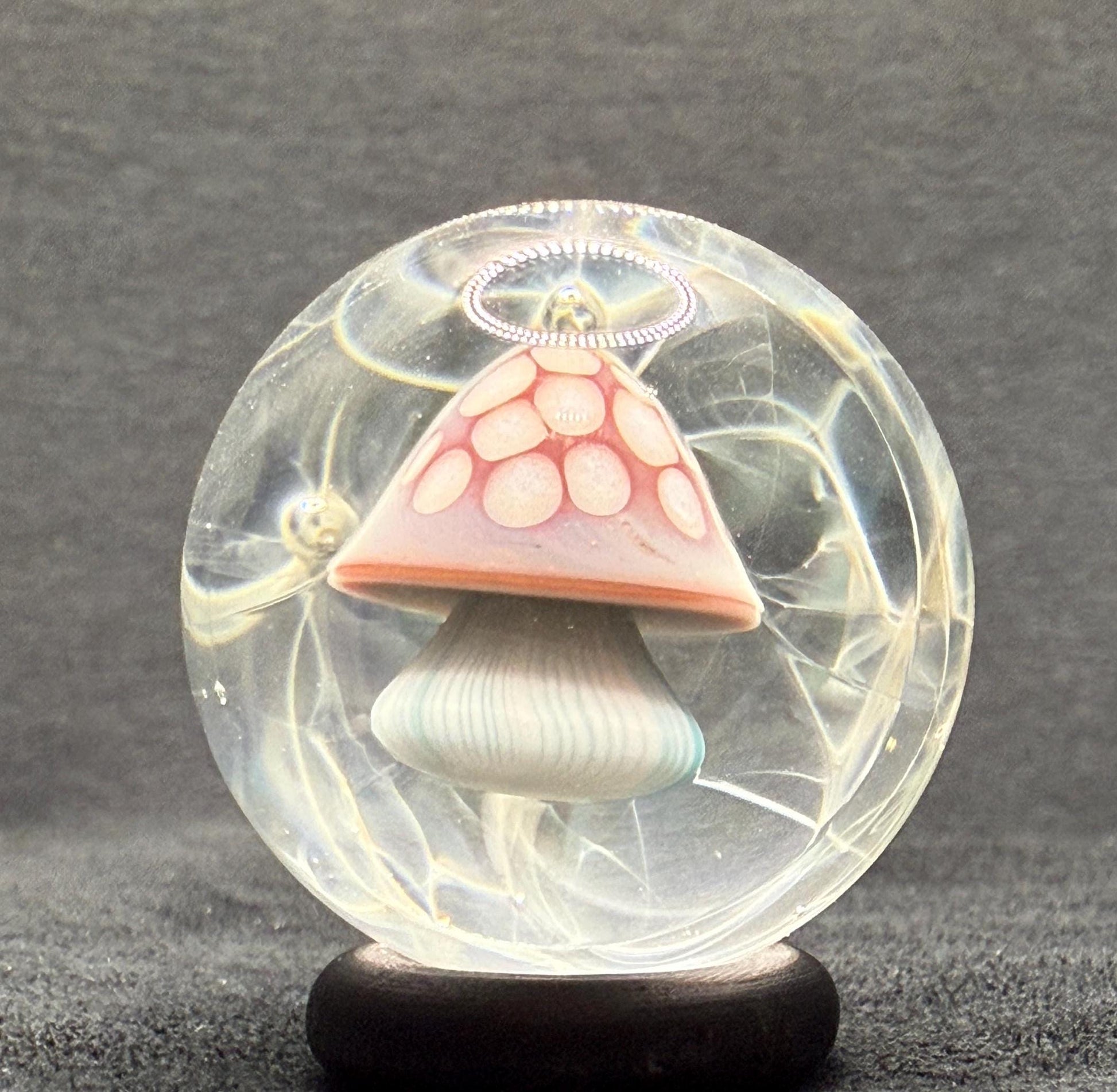 Encased in this borosilicate glass marble is a red mushroom with white spots and a blue striped white stem. Behind the mushroom is a silver fume effect