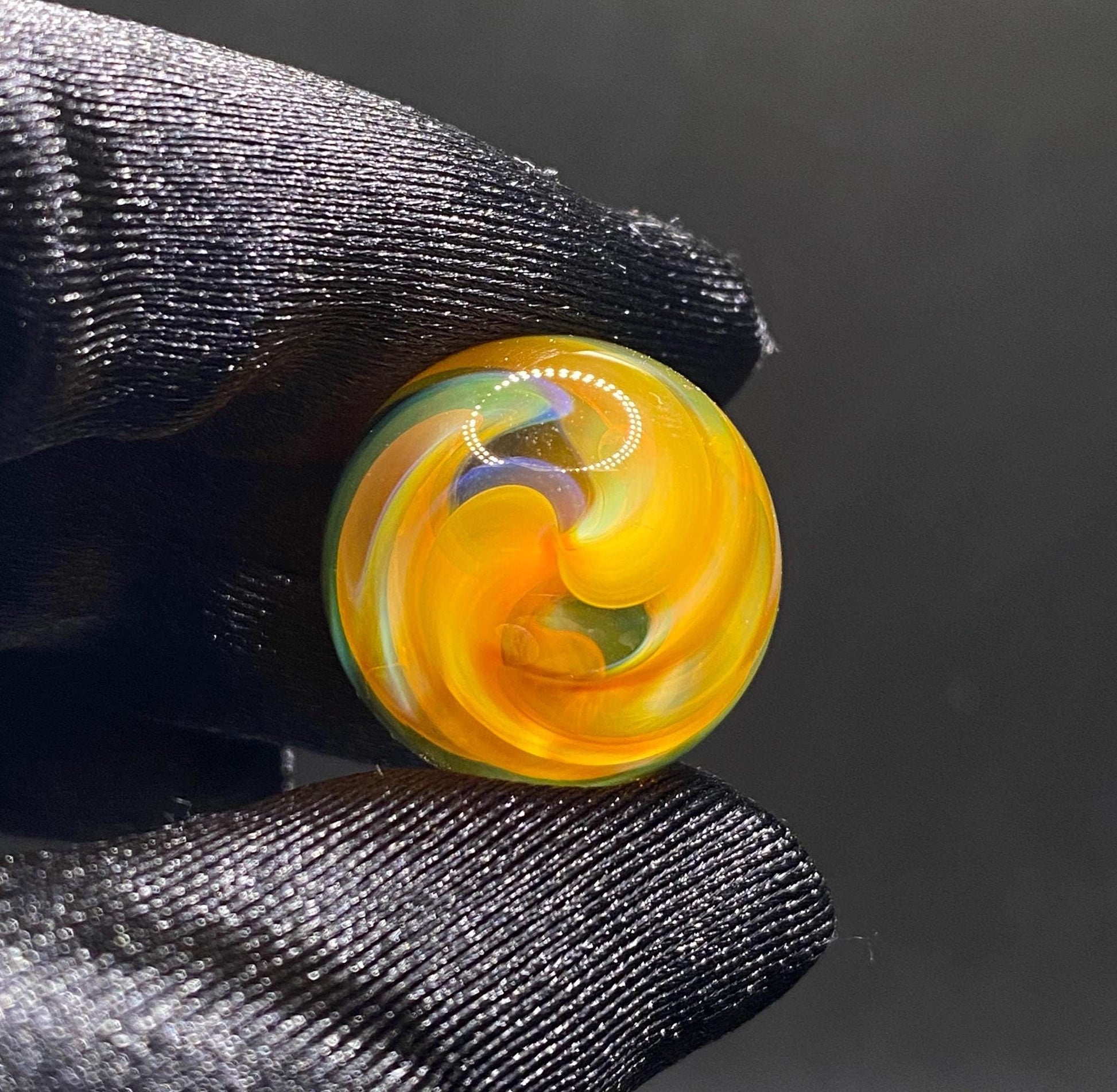 The thick silver fume spiral, is crafted from .99 pure silver, that twirls elegantly inside the marble. The double twist pattern creates a dynamic visual experience, making each viewing angle uniquely captivating.